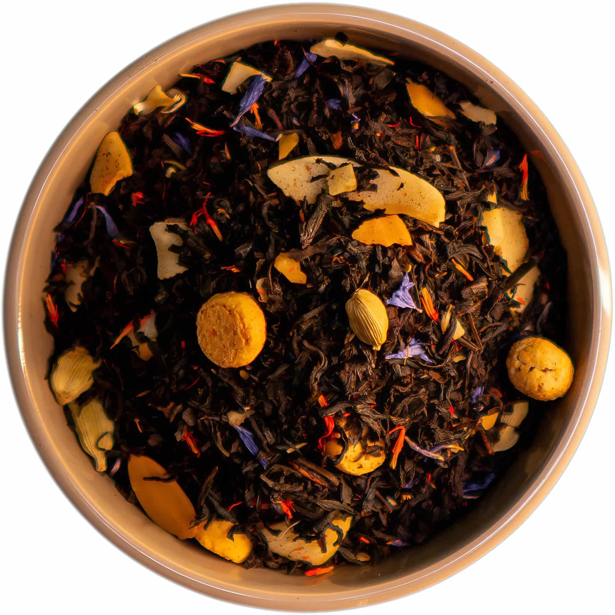 Zutaten: Schwarztee, Mandelhobel, Amarettini, Kokosstücke, Kardamom, Granatapfelkerne, Kornblumenblüten, Aroma