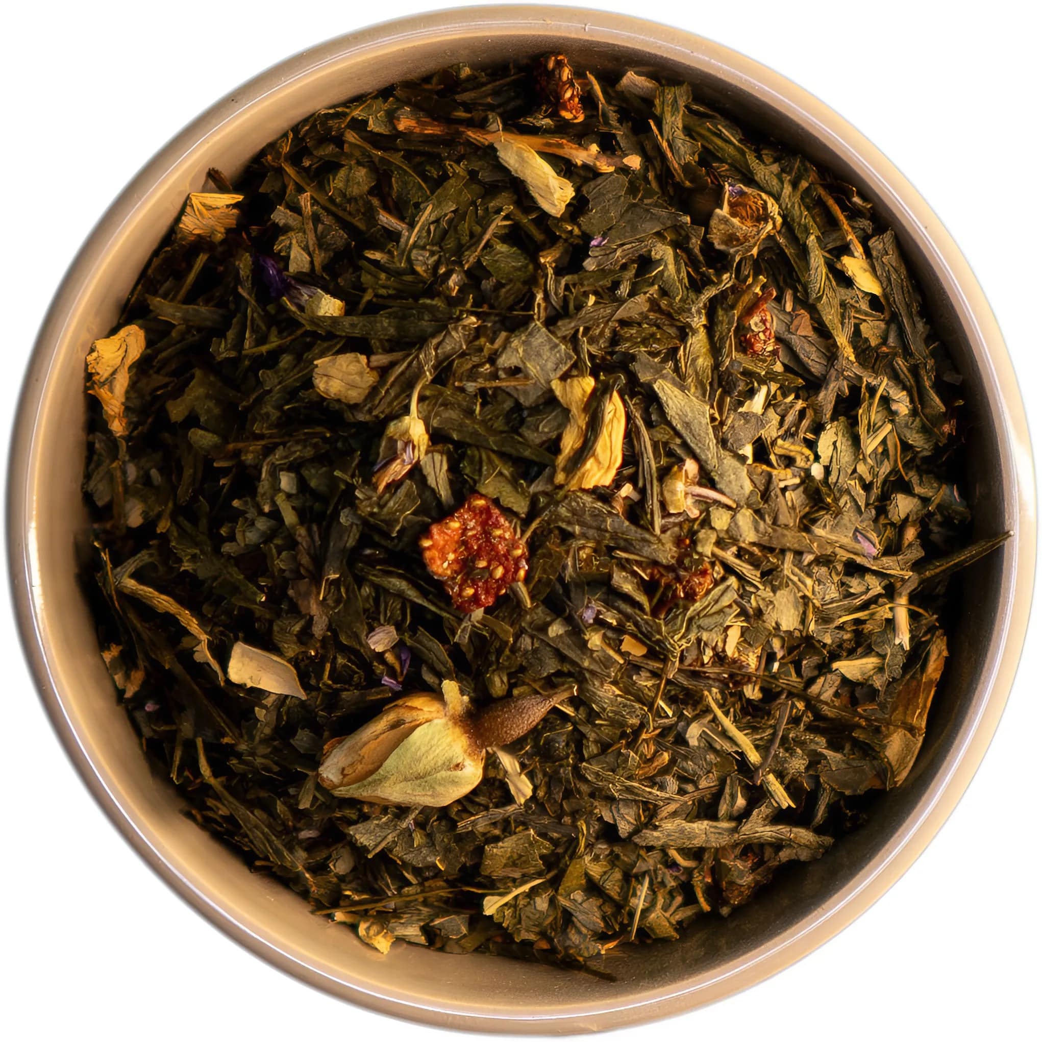 Himbeer Erdbeer Grüntee bringt den Frühling in Ihre Tasse – das ganze Jahr über. Diese erfrischende Mischung vereint die spritzige Frische von Erdbeeren mit dem cremigen Aroma von Vanille. Schon die lebendige Optik mit leuchtenden Rosenknospen und verschiedenen farbigen Blüten zaubert ein Lächeln auf Ihr Gesicht.
